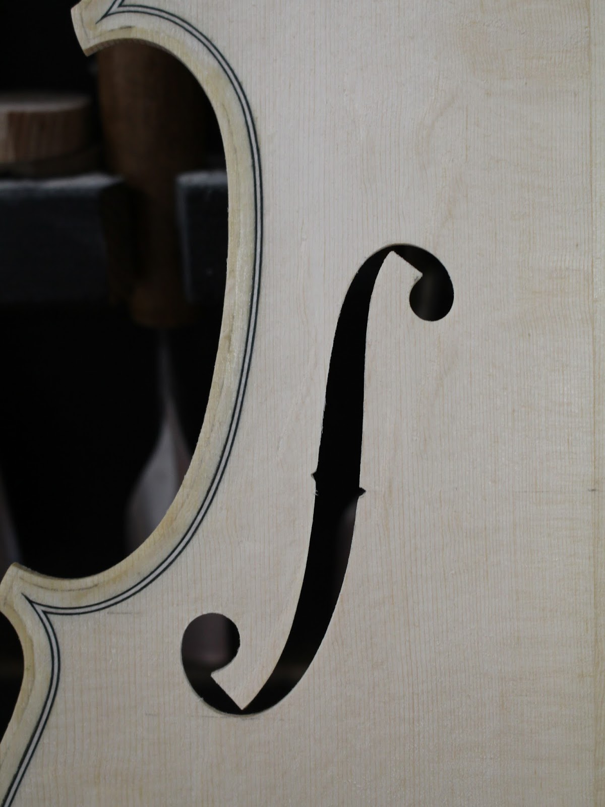 上下の丸だけを決めると後はフリーハンドで切られているF字孔は、