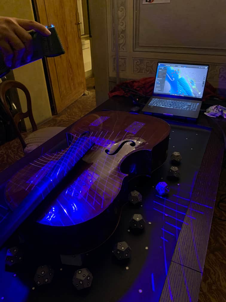 さらに今回は、著名な鑑定家ブロット工房に所属し、デジタル技術のエキスパートである野瀬光星氏の協力を得る事が出来、最新の3Dスキャン技術を駆使して楽器の形状を完全に記録することが出来ました。精密な3Dデータをパソコンやスマートフォン上で閲覧するだけでなく、3Dデータから作成した最新の3Dプリントモデルは、スクロールで0.1mm、ボディで0.2㎜の精度で再現されています。博物館にもないほど最高精度で再現する事ができ、傷や歪みの位置の確認まで、製作過程で何度も参照する貴重な資料となりました。